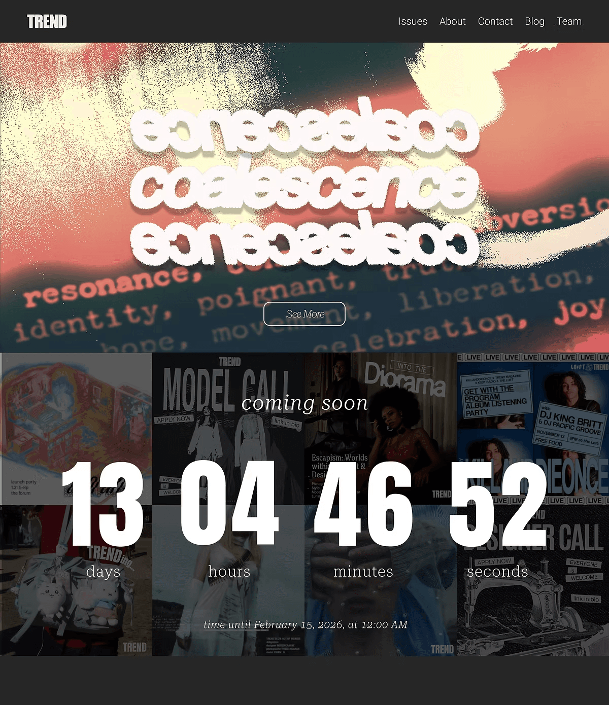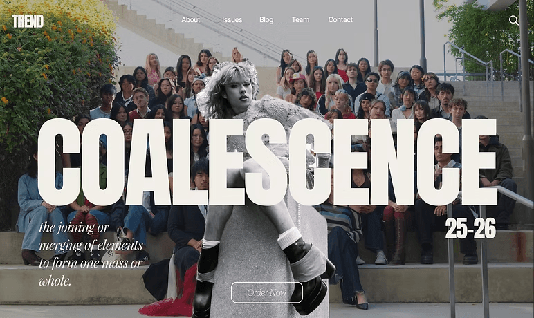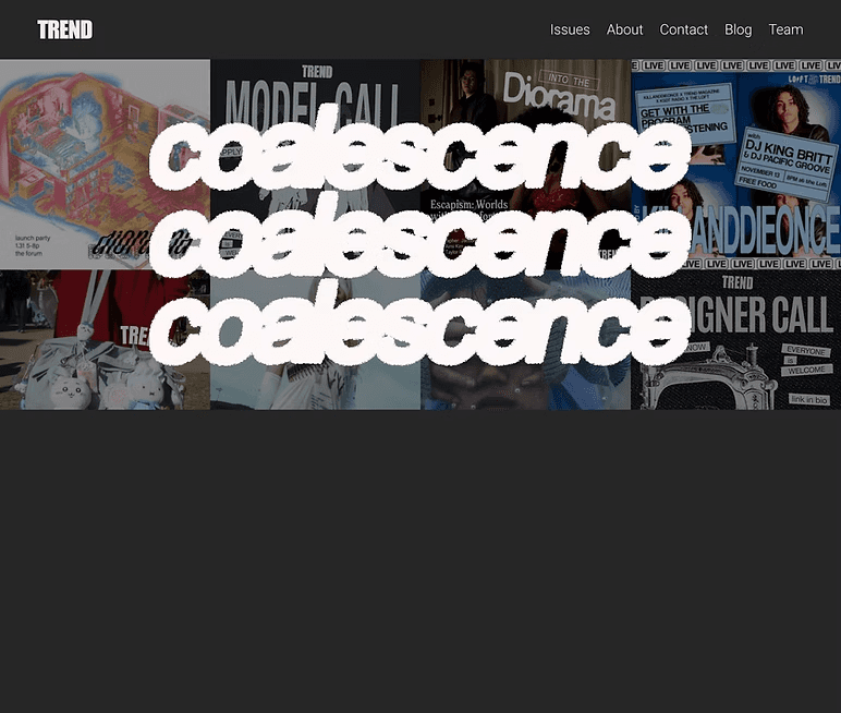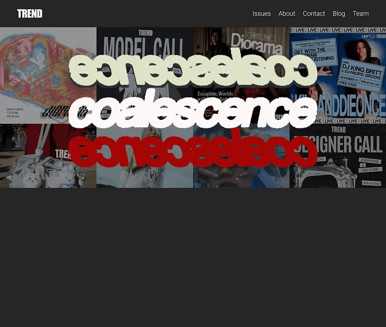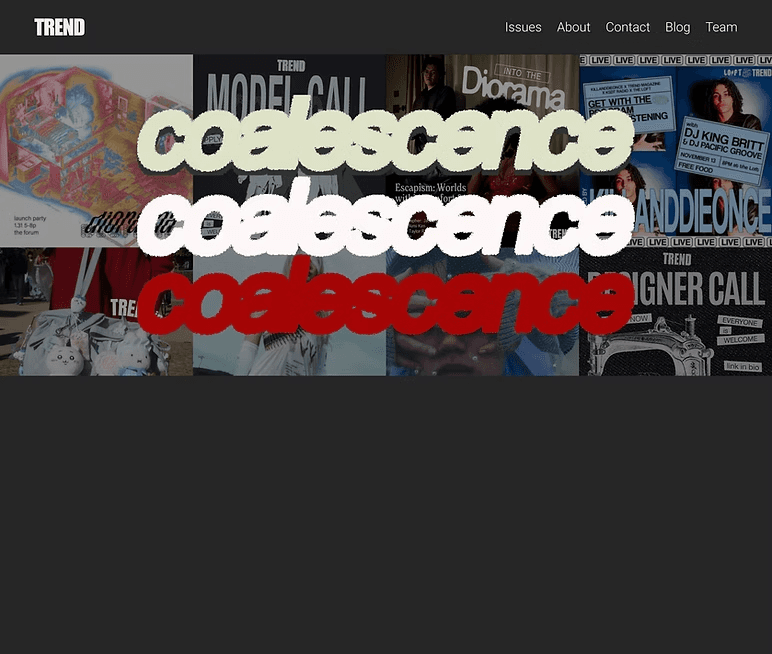 Coalescence is UCSD TREND Magazine’s Fall/Winter issue, featuring editorial work that highlights fashion, culture, and student creativity. For this project, I designed the landing page experience for the issue with a focus on visual storytelling, clarity, and smooth navigation across devices. My goal was to create a polished, on-brand page that captured the mood of the collection while making it easy for readers to explore the issue, view content, and engage with TREND’s digital presence.