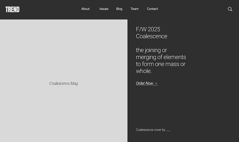 The final Coalescence landing page is a polished, responsive experience designed to reflect TREND’s Fall/Winter editorial tone while keeping navigation clear and intuitive. Building off my teammate’s original concept, I redesigned and refined the page into the final version by strengthening visual hierarchy, improving layout consistency, and tightening typography and spacing for a cleaner overall UI. My goal was to create an on-brand landing page that feels visually elevated while still being fast to scan and easy for readers to explore.
