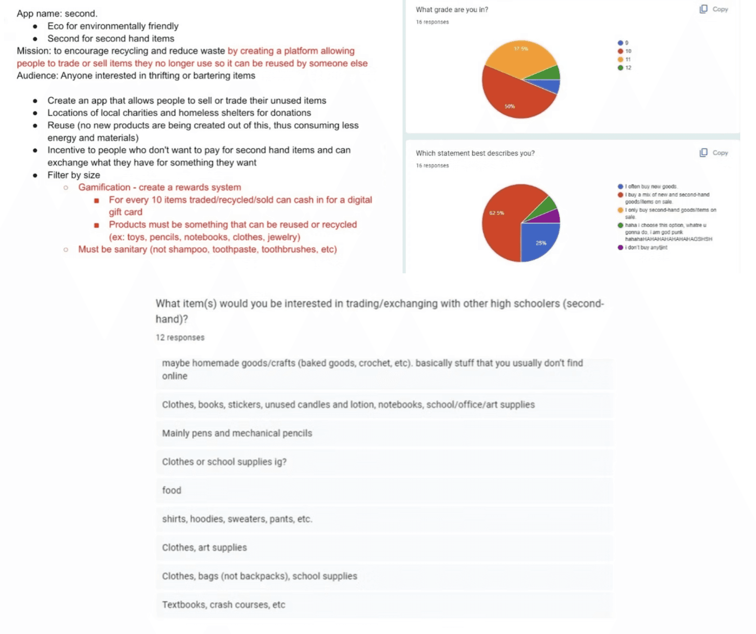 Rather than relying on internet-derived data, I opted to create a personalized Google Form to collect insights directly from my peers. Following the survey responses, I extended my research efforts by exploring potential tradable items and gathering information for an additional app feature. This feature facilitates users in searching for local charities and donation centers, promoting community engagement and reducing waste production by providing alternatives to discarding items. Furthermore, it offers users the opportunity to discover nearby second-hand shops, facilitating budget-friendly, sustainable shopping experiences.
